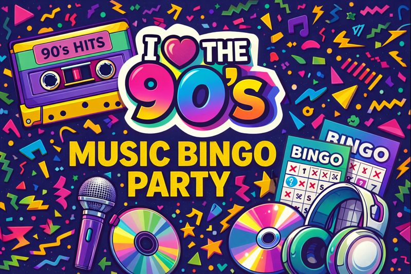 Break out the flannel, frosted tips, and questionable dance moves — I Love the 90’s Music Bingo Sing-Along Night is here! We’re turning back the clock to the decade of boy bands, grunge, hip-hop, pop divas, and absolute bangers you still know every word to.
